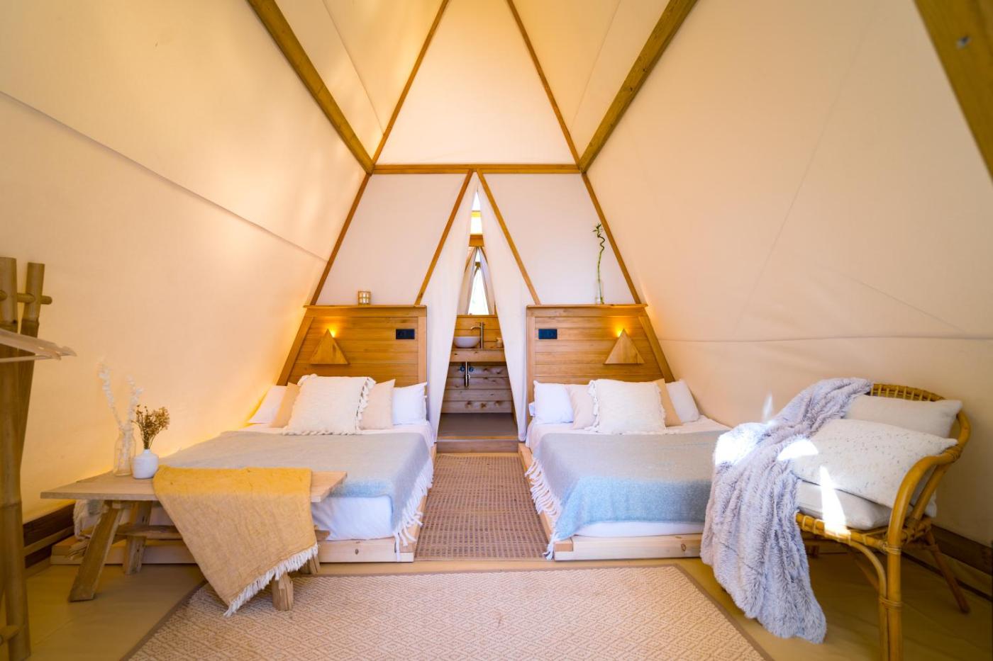 Tienda Buka XL con baño exterior privado. Esta tienda ofrece baño privado con ducha. Incluye una zona de comedor al aire libre y muebles de exterior. El alojamiento dispone de 2 camas. ;